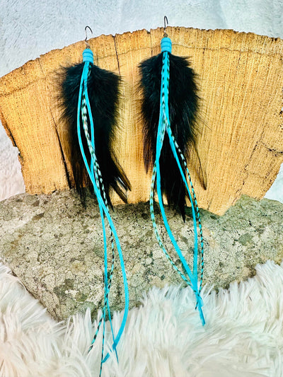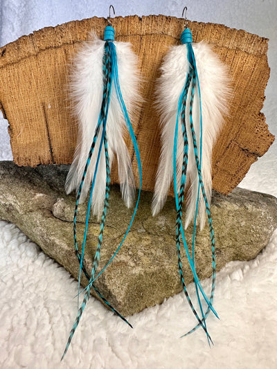 8 Inch Beautiful Handmade Turquoise, White and Black Feather Grizzly Earrings