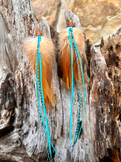The Arizona– 8 inch Teal and Ginger Handmade Unique Feather Earrings