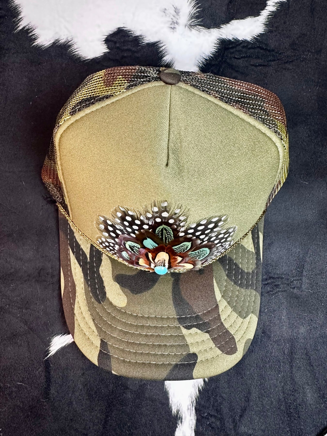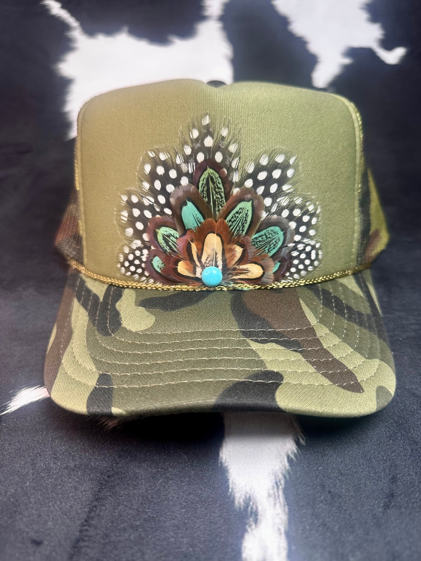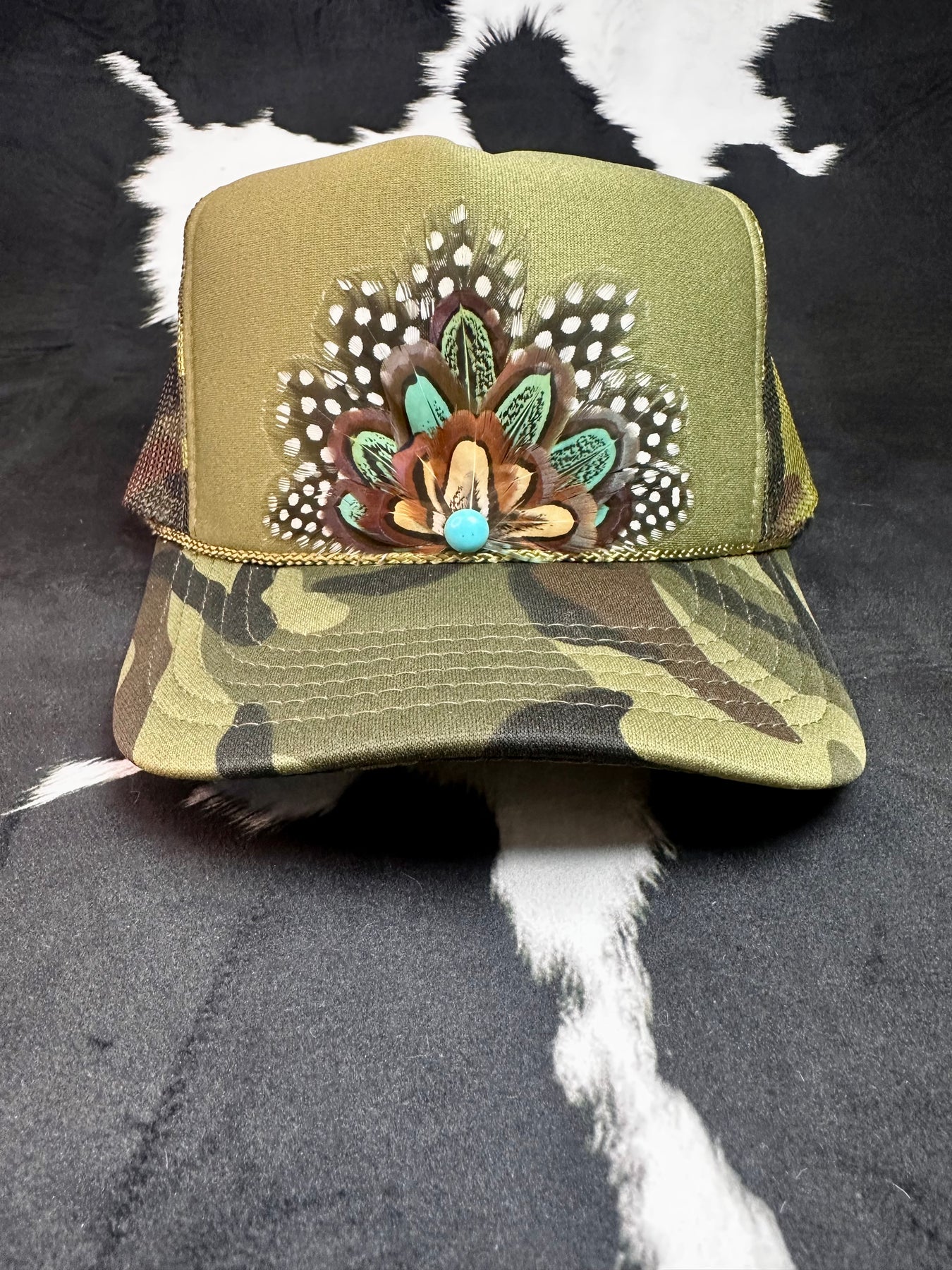 Camo Feather Trucker Hat — Brown Pheasant + Polka Dot Feathers with Round Turquoise Stone