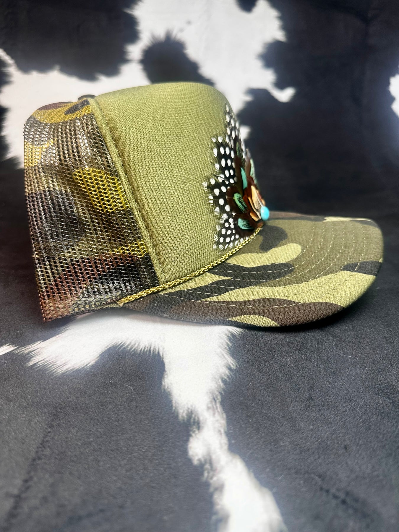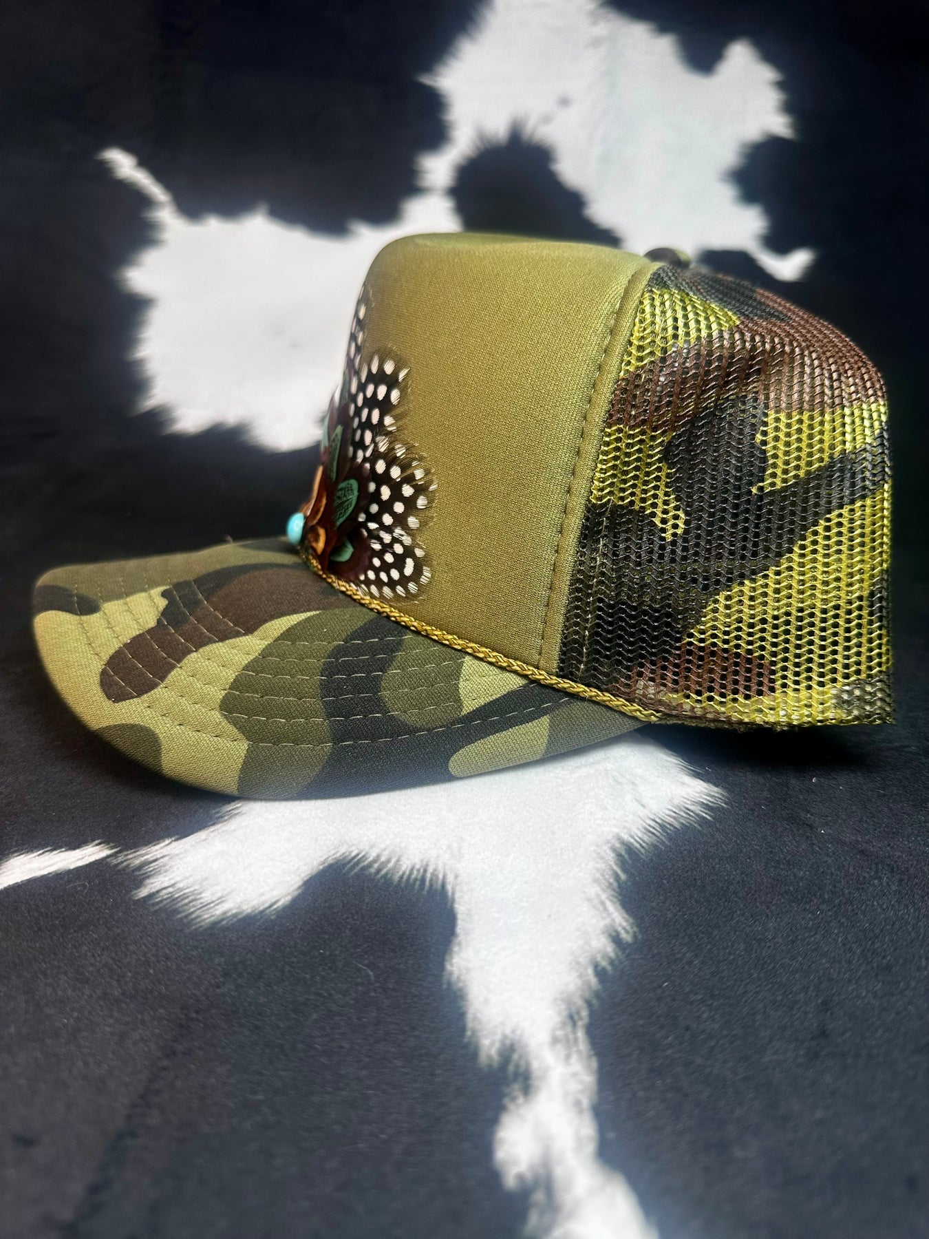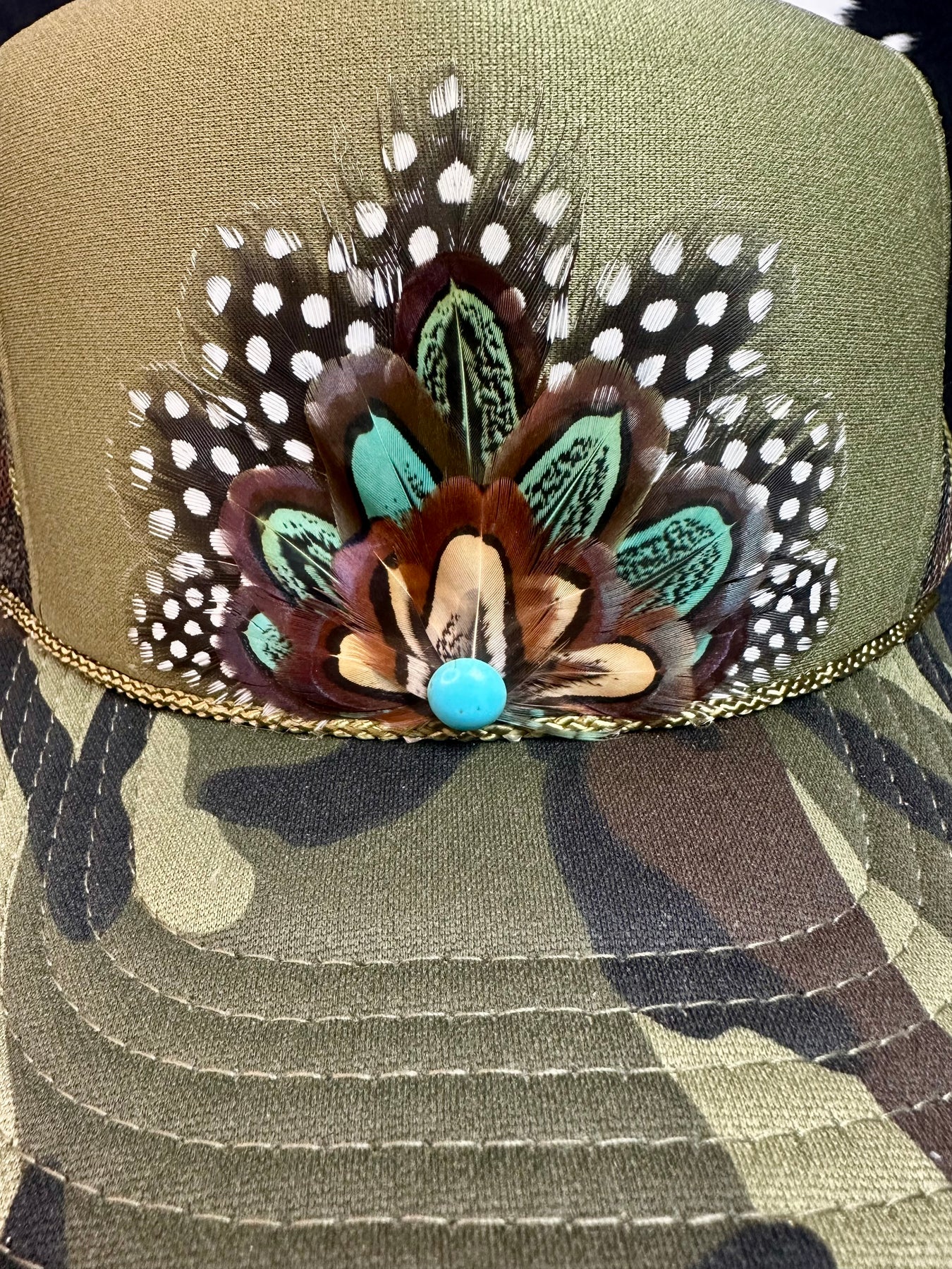 Camo Feather Trucker Hat — Brown Pheasant + Polka Dot Feathers with Round Turquoise Stone