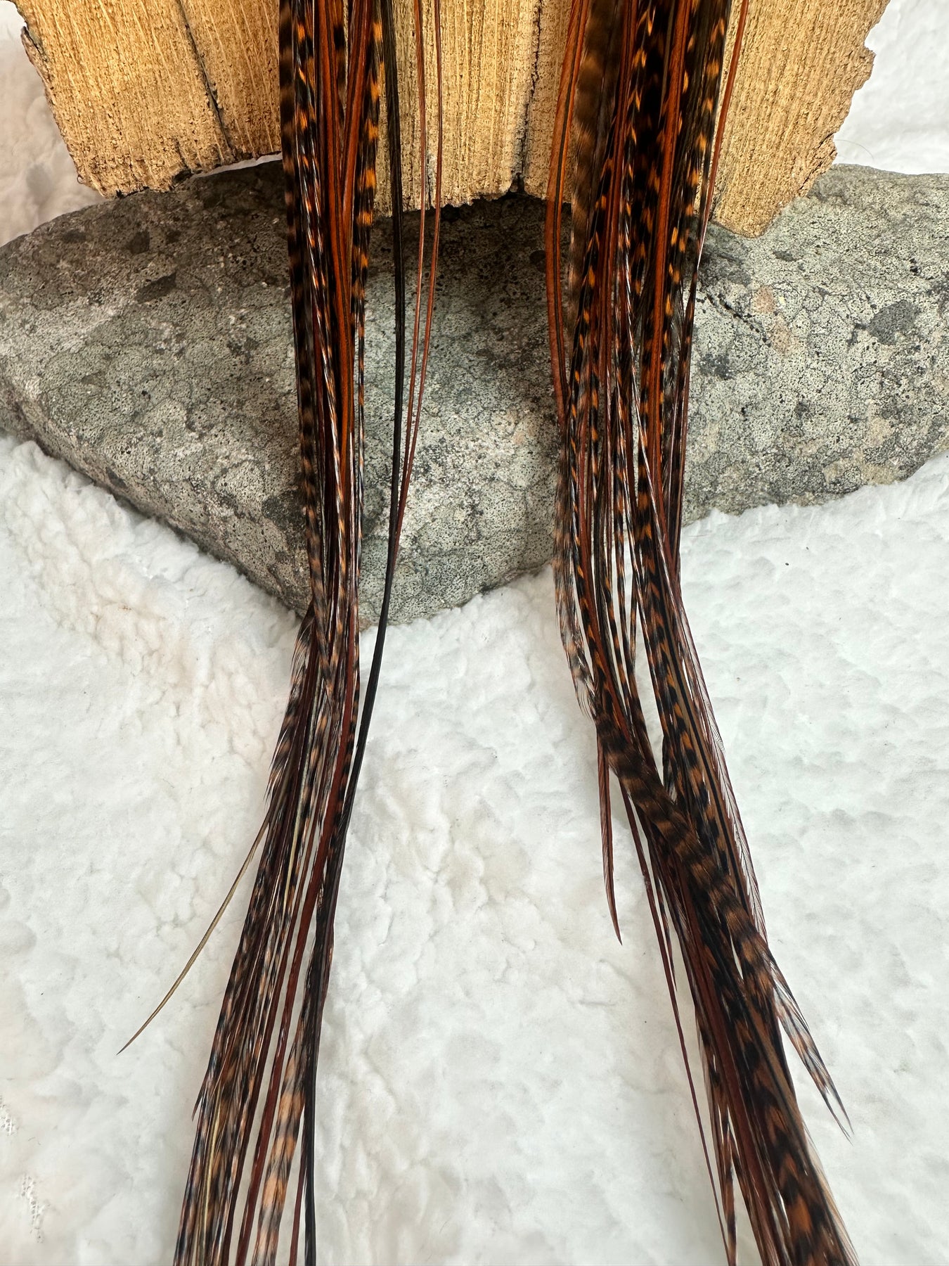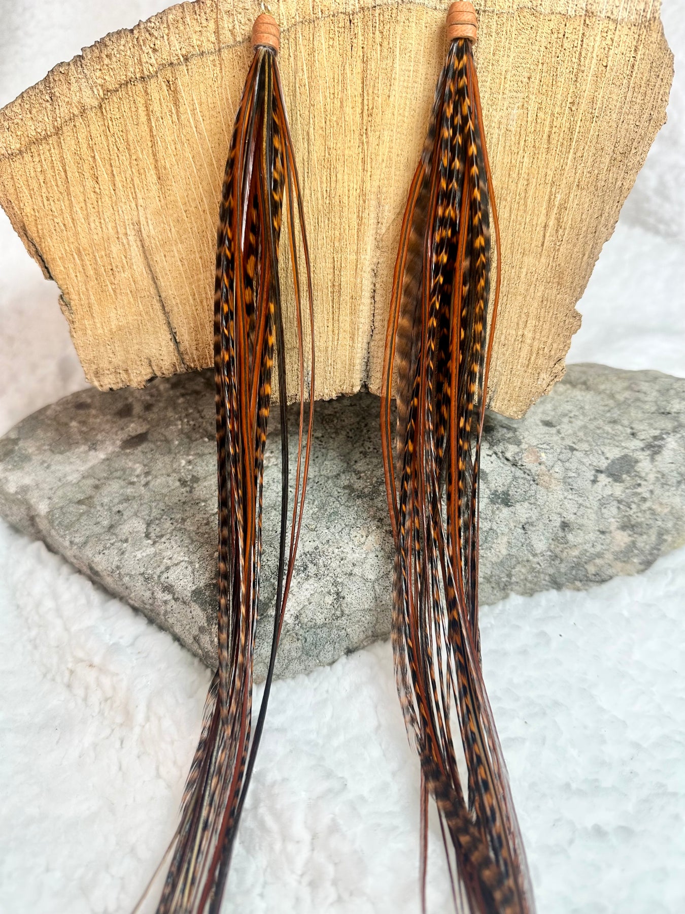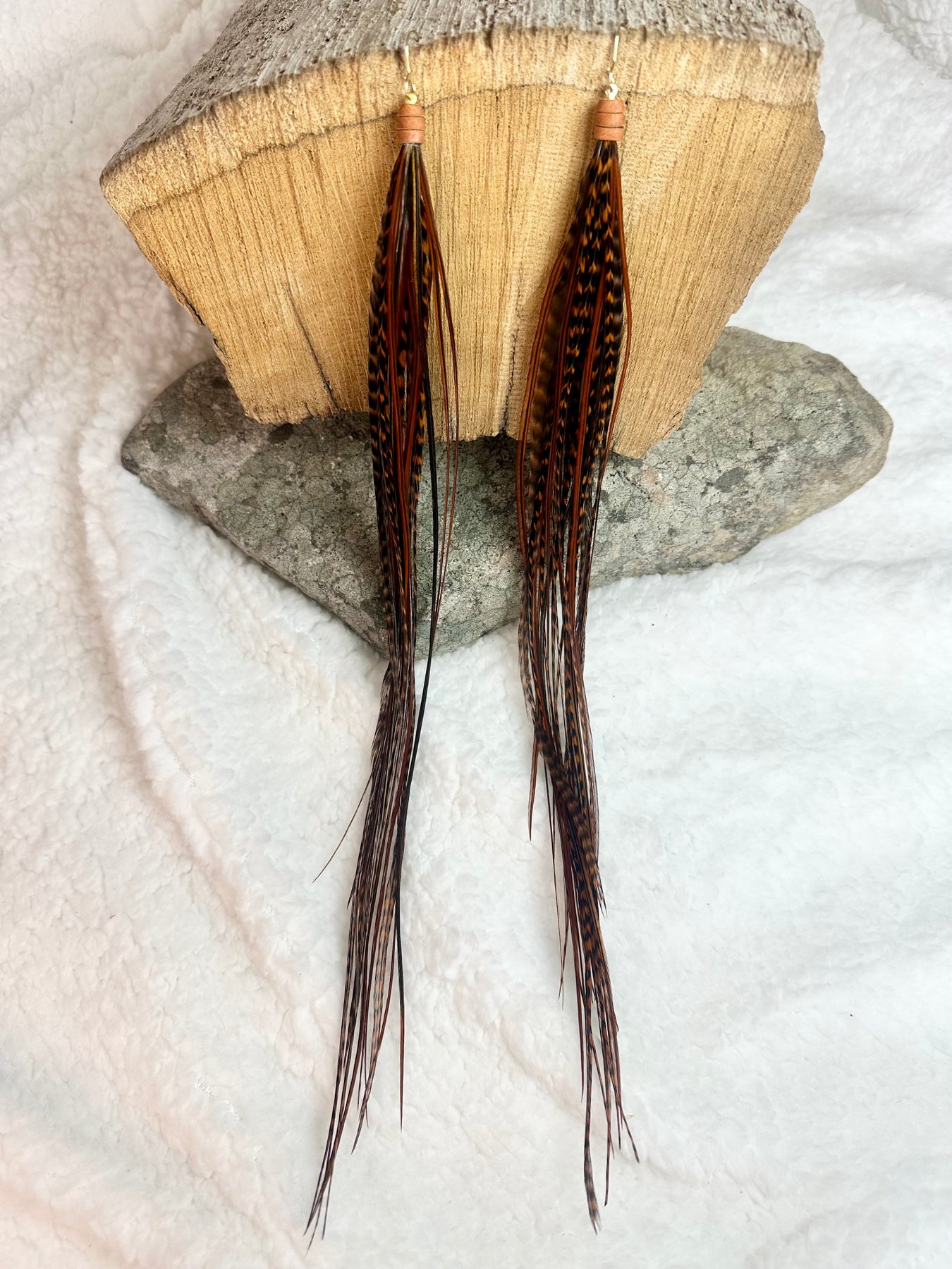 These earrings are all about natural texture and movement. Solid brown and brown grizzly feathers create a rich, earthy look with depth and contrast. Long and dramatic, they make a statement without trying too hard.