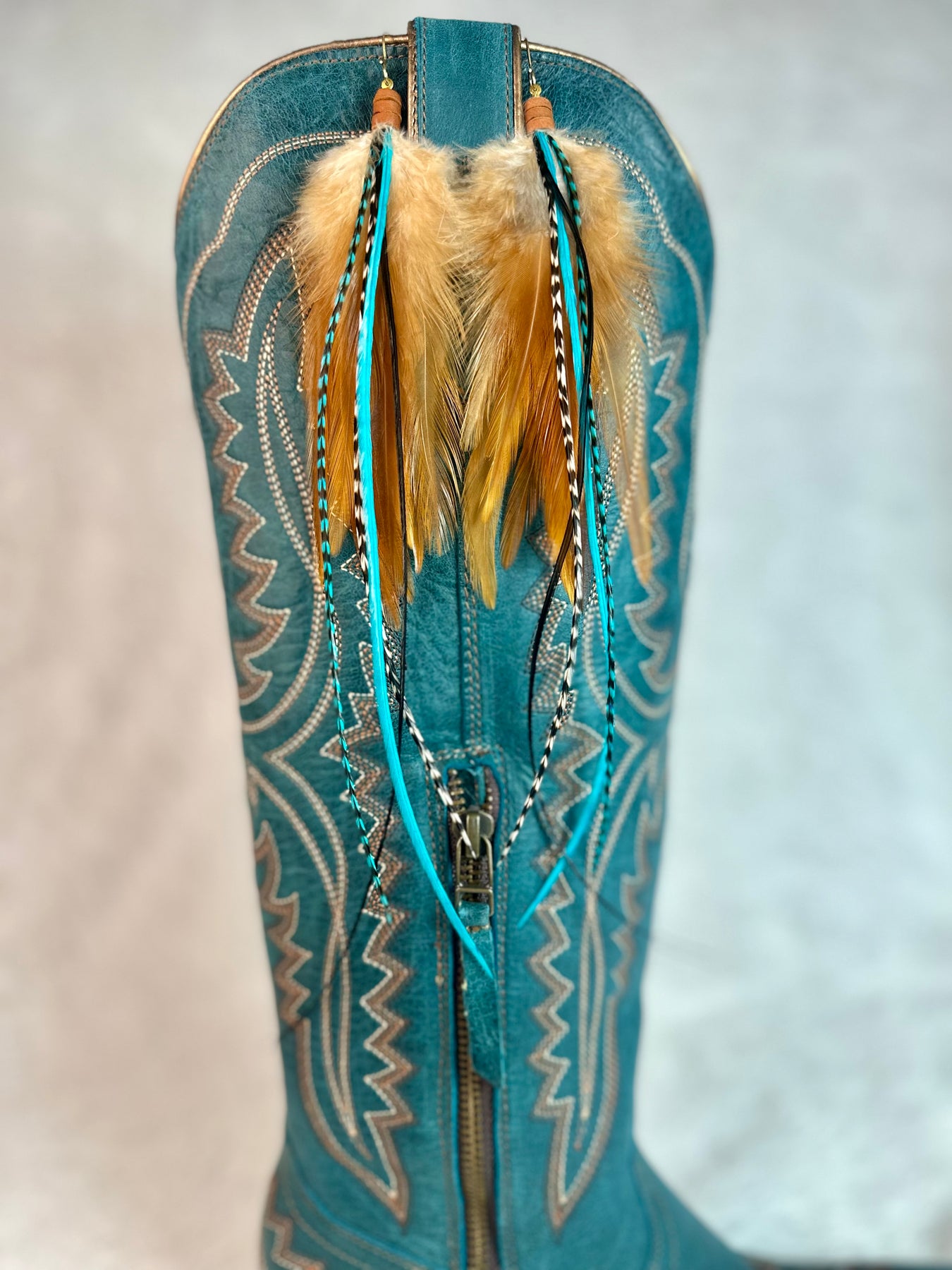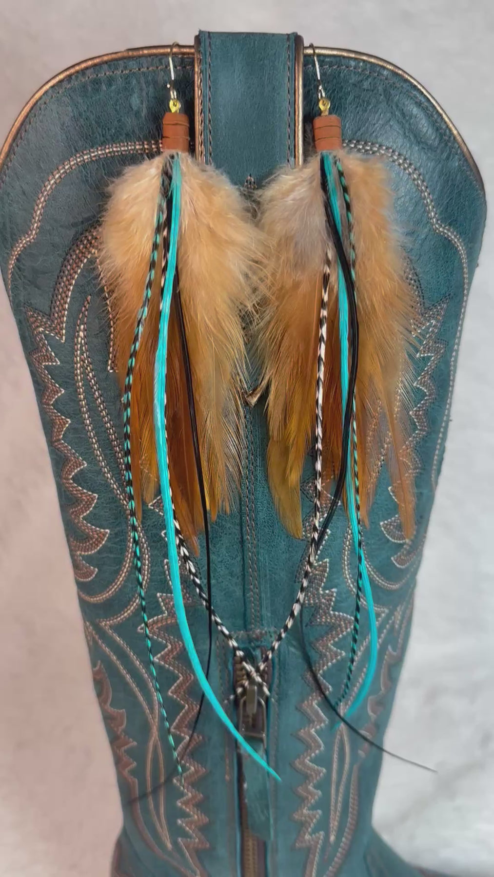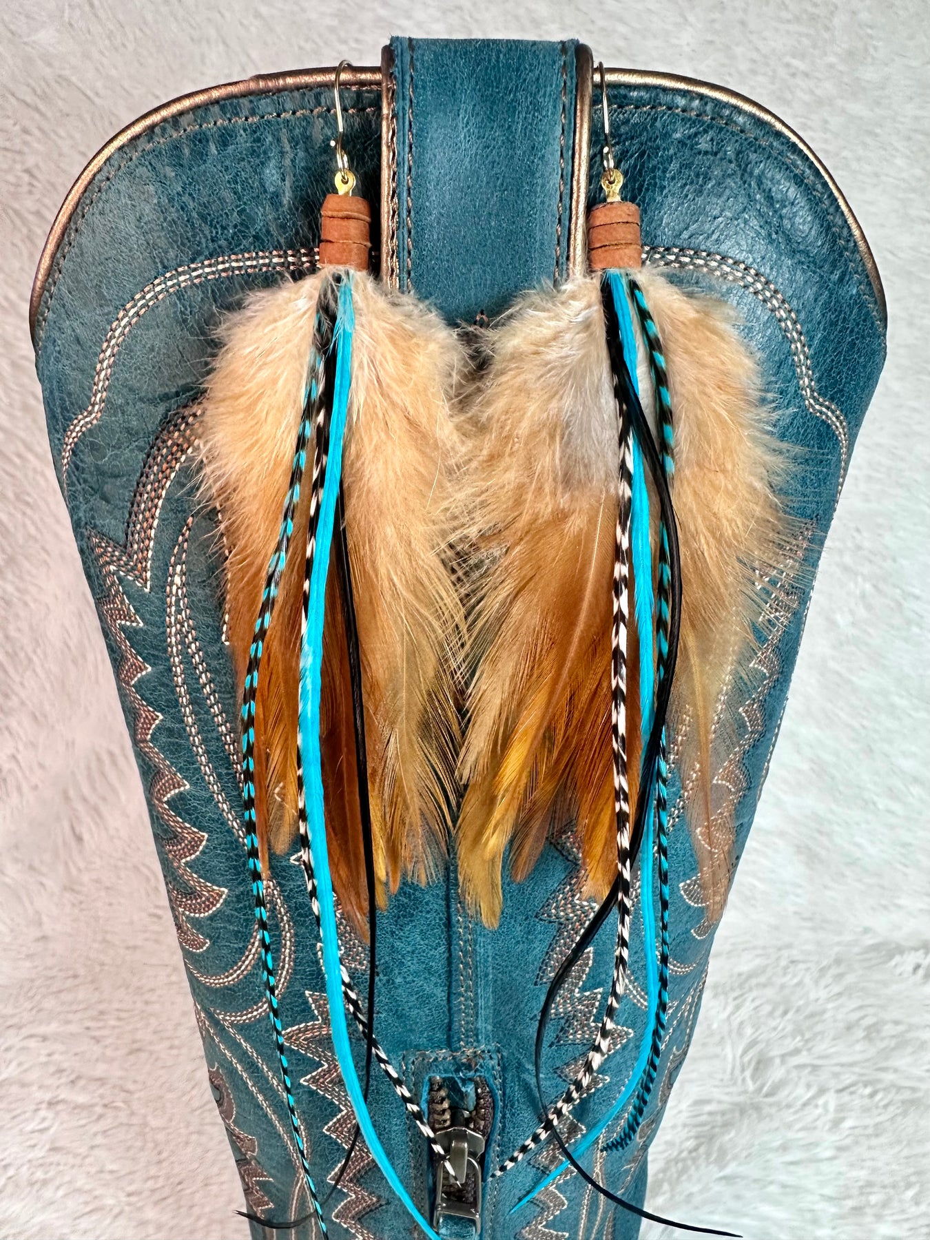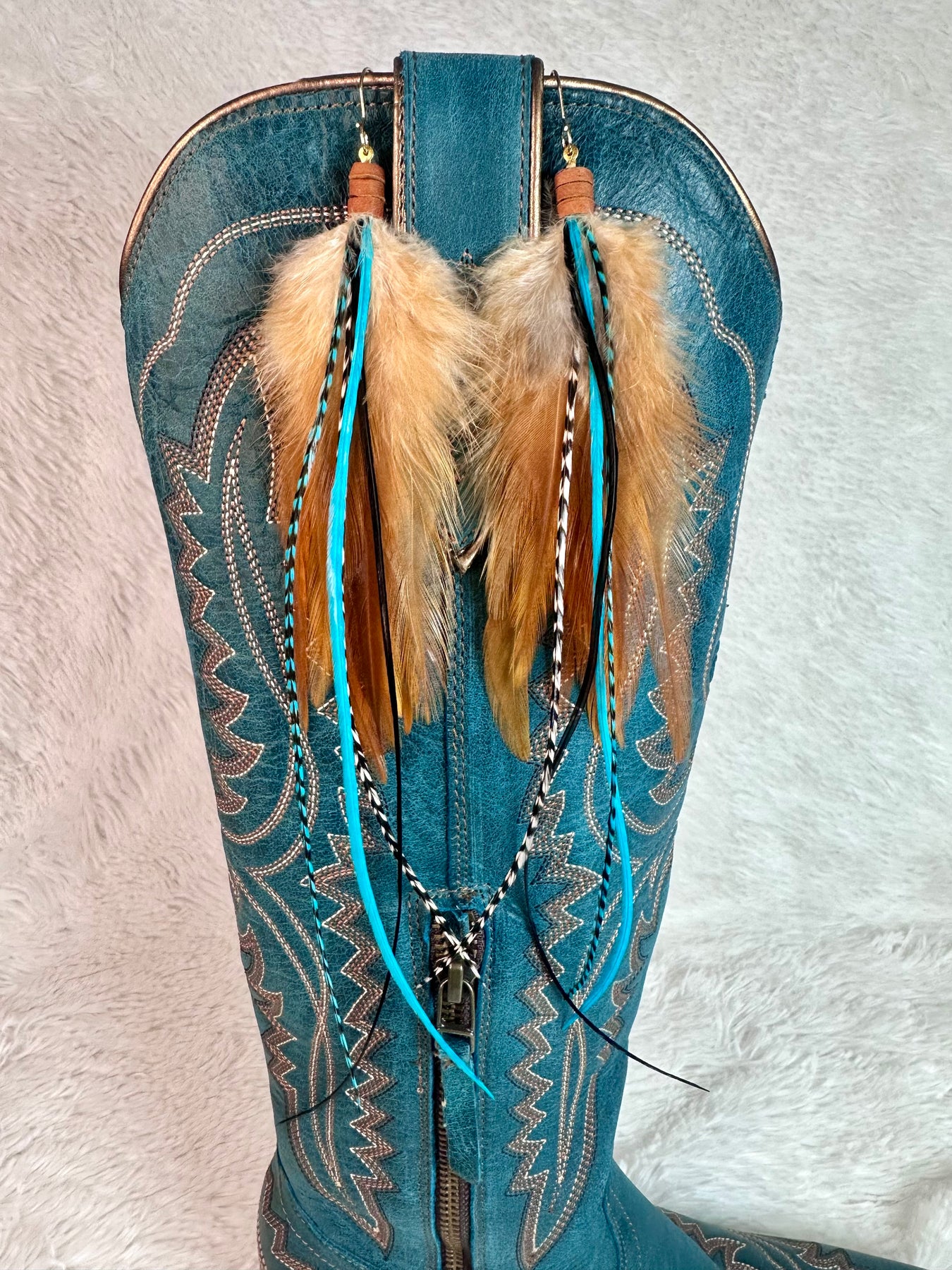 COLOR A rich brown base layered with turquoise highlights and black and white grizzly feather accents. Smart, grounded, and impossible to ignore.