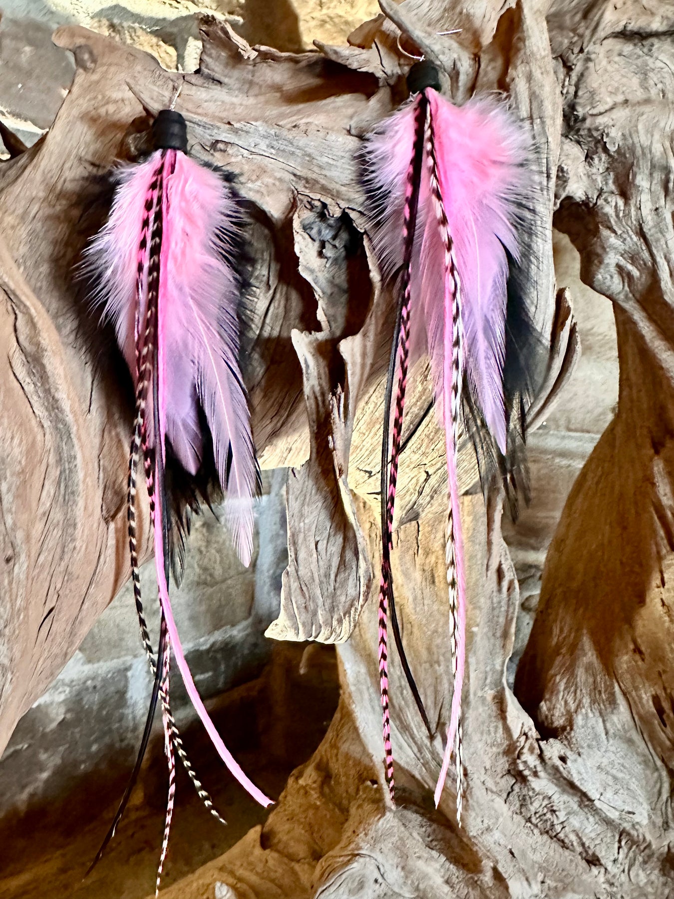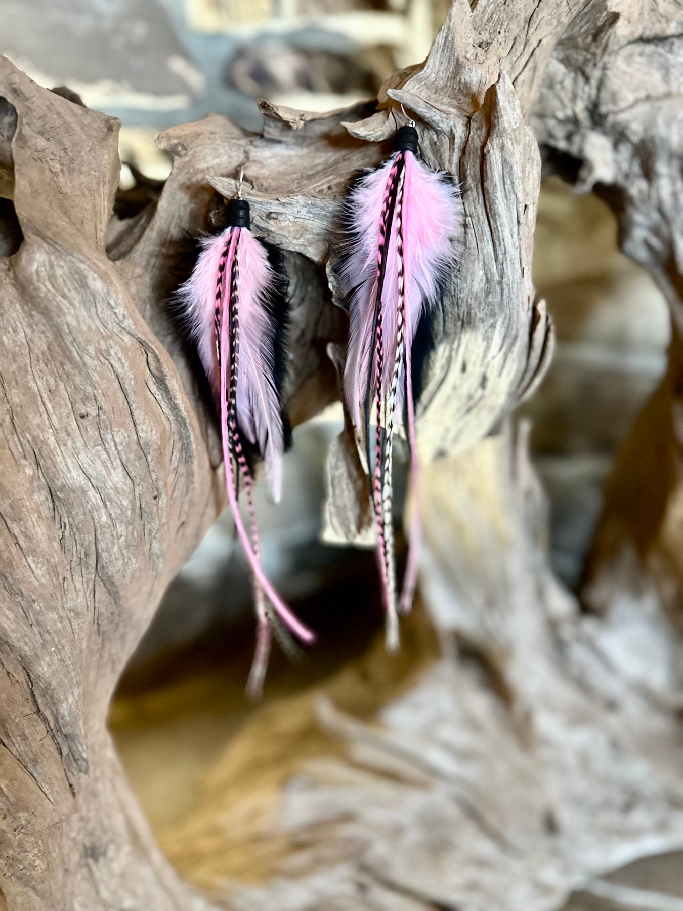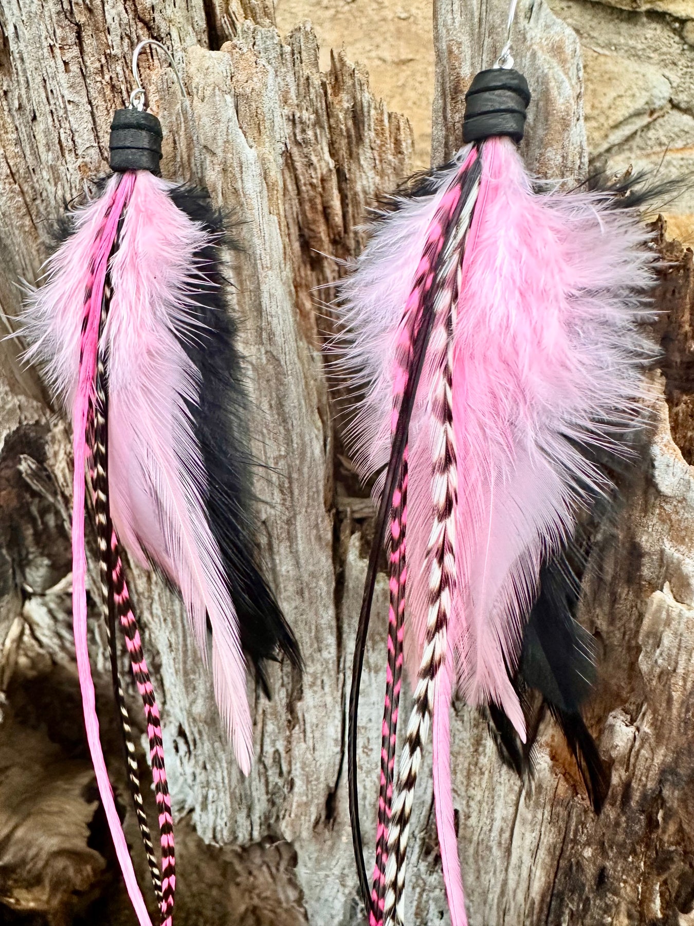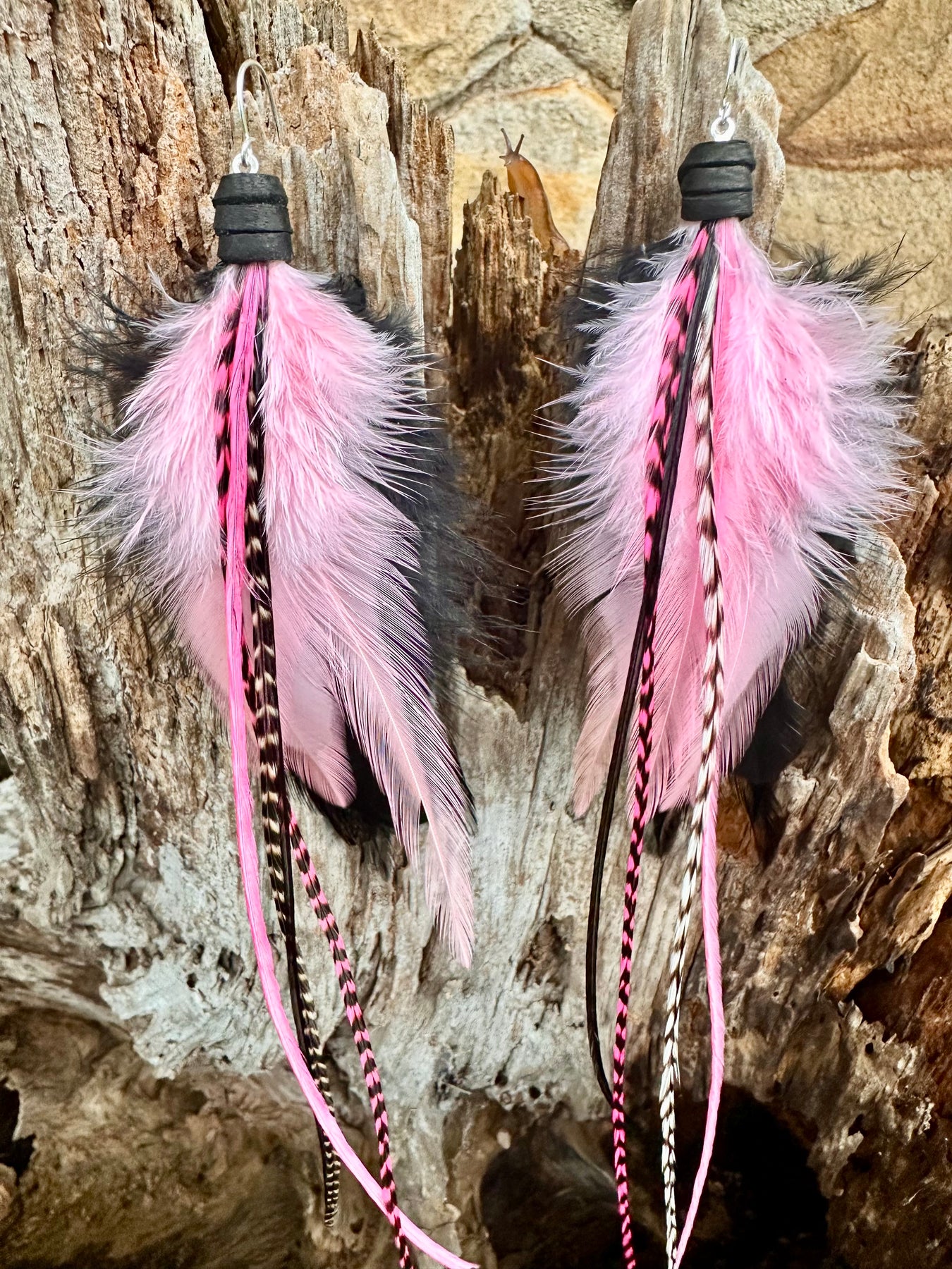 The Vicki earrings are inspired by a friend whose warmth is unmatched and whose spirit is always in motion. As a flight attendant, Vicki chases sunsets and brings kindness wherever she lands. These earrings capture her heart and her flair—hot pink and black feathers paired with bold grizzly textures for just the right spark.