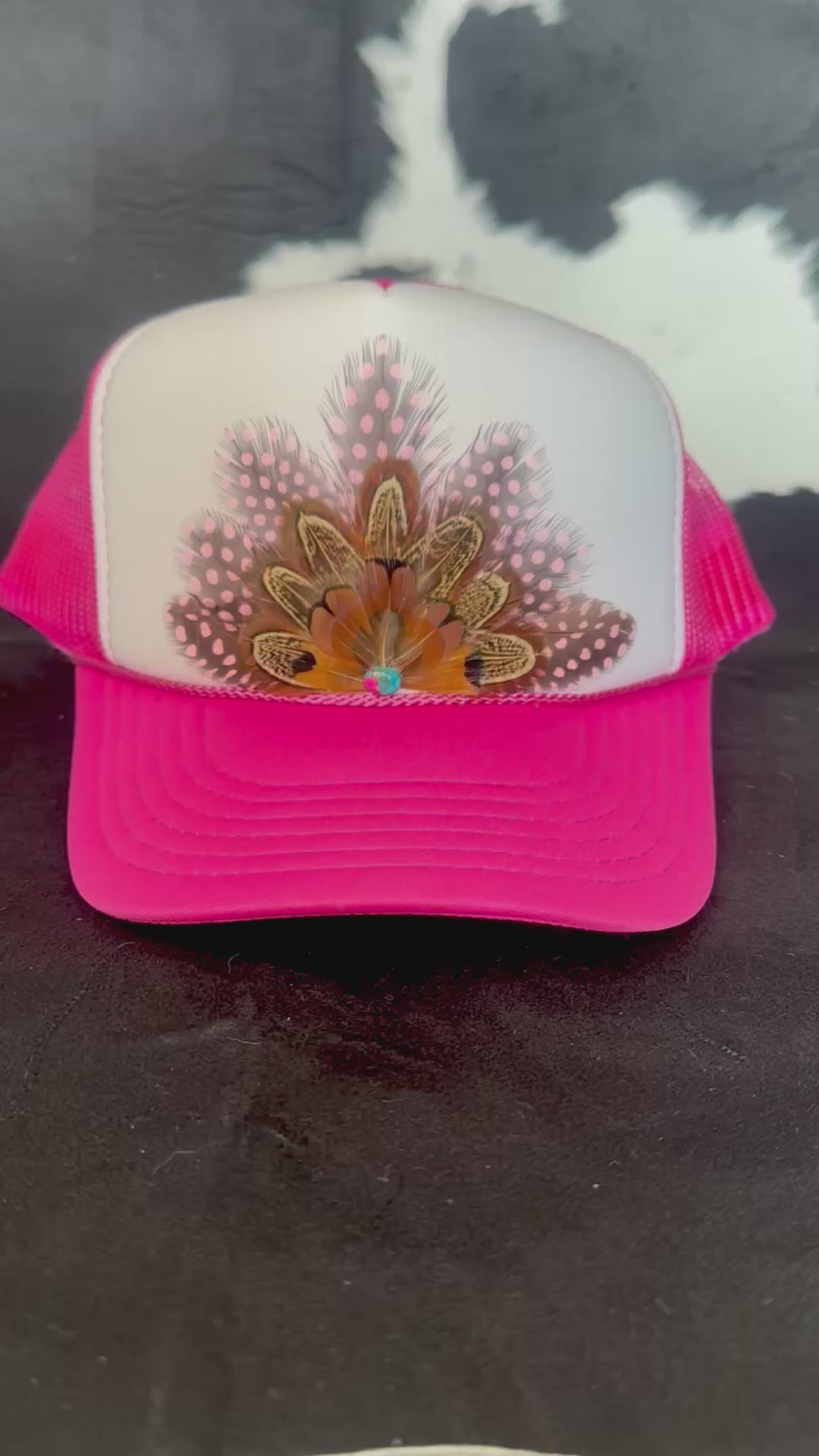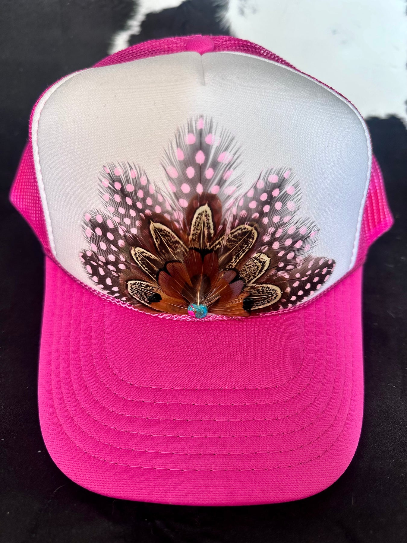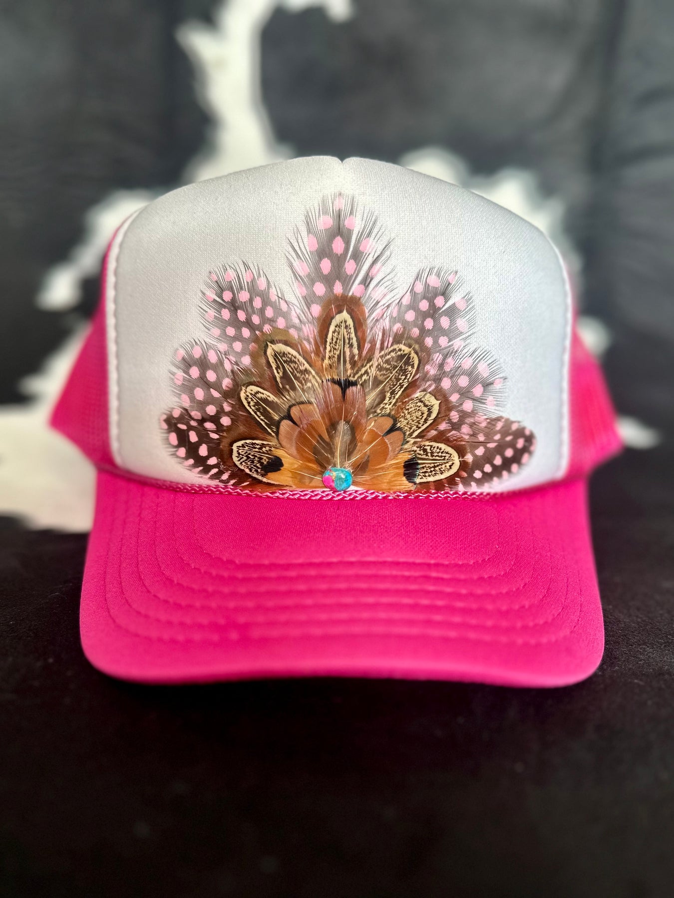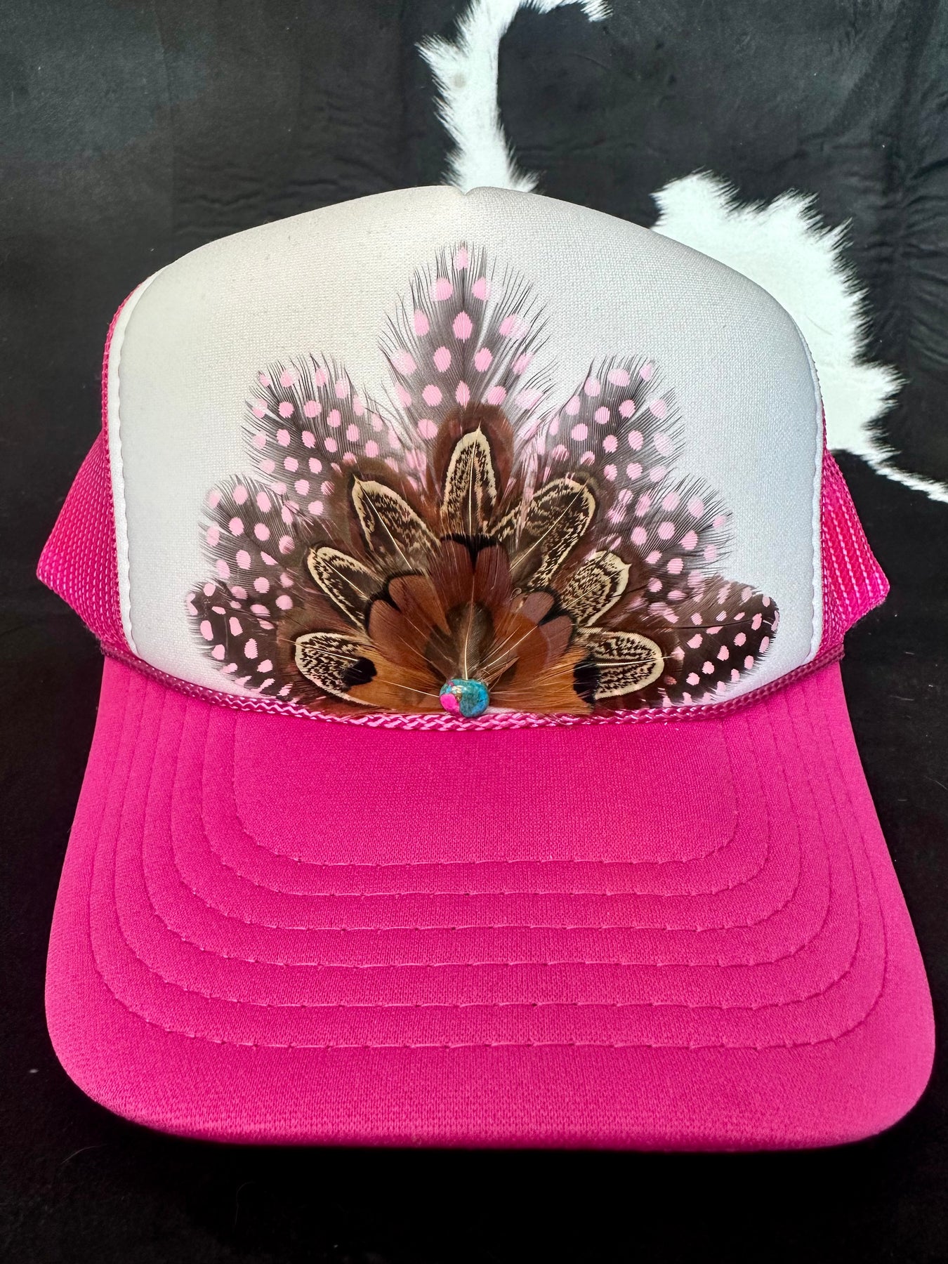 This feather snapback trucker hat blends soft pink polka dots with rich brown pheasant feathers for a look that feels energetic, textured, and full of movement. Finished with a Cotton Candy Turquoise cabochon gemstone for a subtle pop of color and contrast, this hat strikes the perfect balance between playful and grounded. Built on a 5-panel, high-profile mesh-back trucker hat, it delivers that tall crown and bold streetwear-trucker vibe you love. A true statement piece with personality.