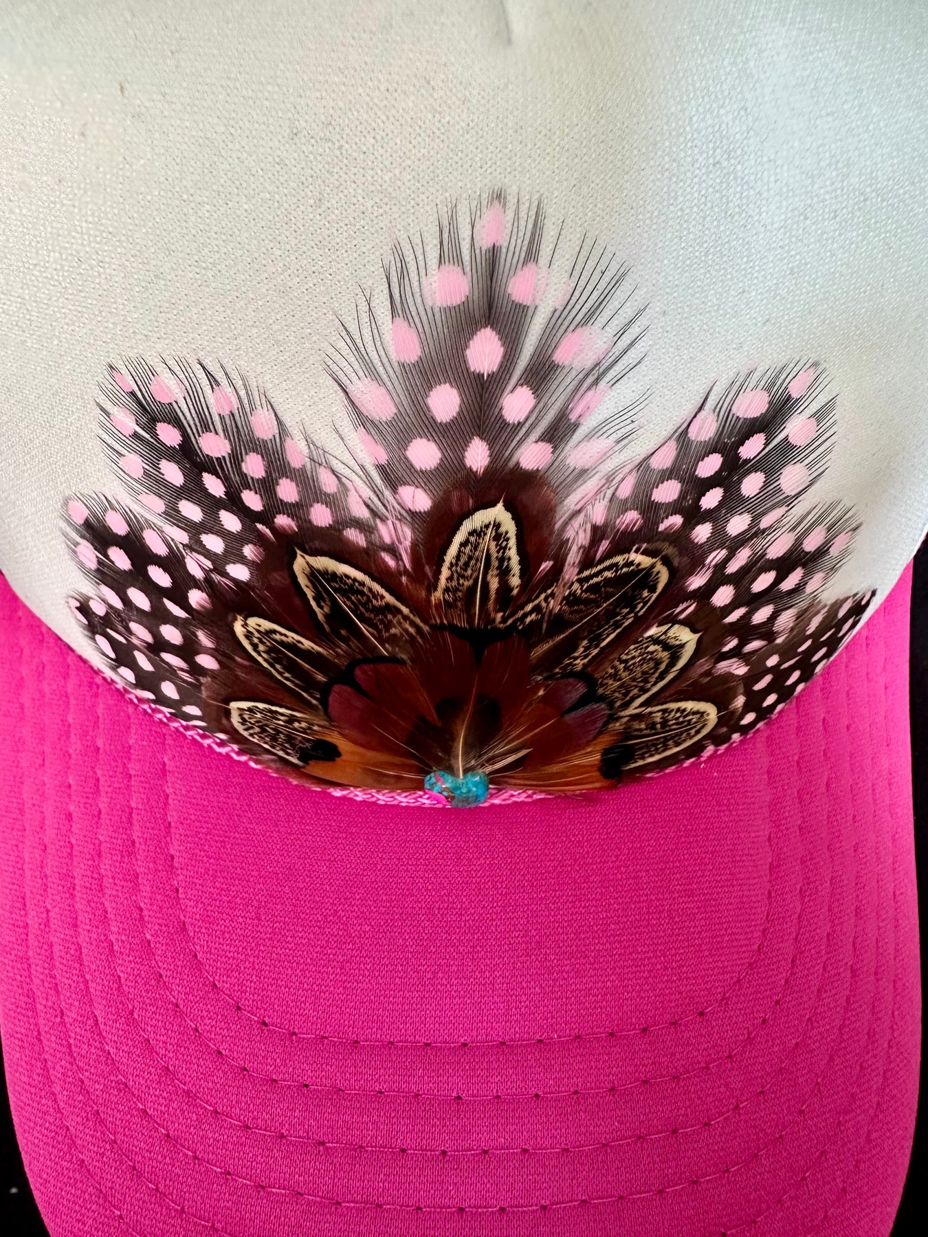 Feather Trucker Hat-Pink Polka Dot + Brown Pheasant Feathers + Cotton Candy Turquoise Cabochon Gemstone