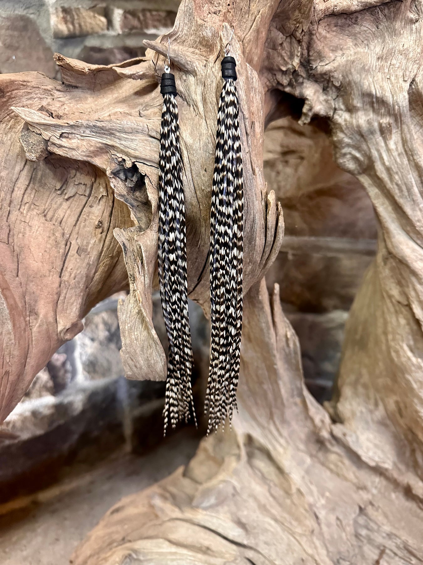 Handmade with a mix of deep black, striking grizzly, and soft white feathers, they’re bold, radiant, and full of light—just like her.